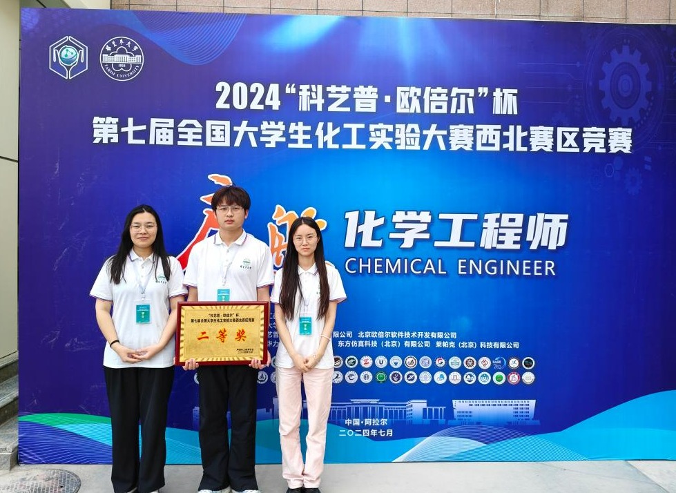 2024年7月14日—17日,中国化工教育协会主办的第七届“科艺普•欧倍尔”杯全国大学生化工实验大赛西北赛区竞赛在新疆塔里木大学举办。本次赛事共有来自西北赛区47所高校的87支代表队参与。由李连庆教授带队,应用化学专业2021级学生魏引乐、丁雨晨、孟干组成的“从容应队”,在范妮老师的悉心指导下荣获西北赛区“二等奖”。