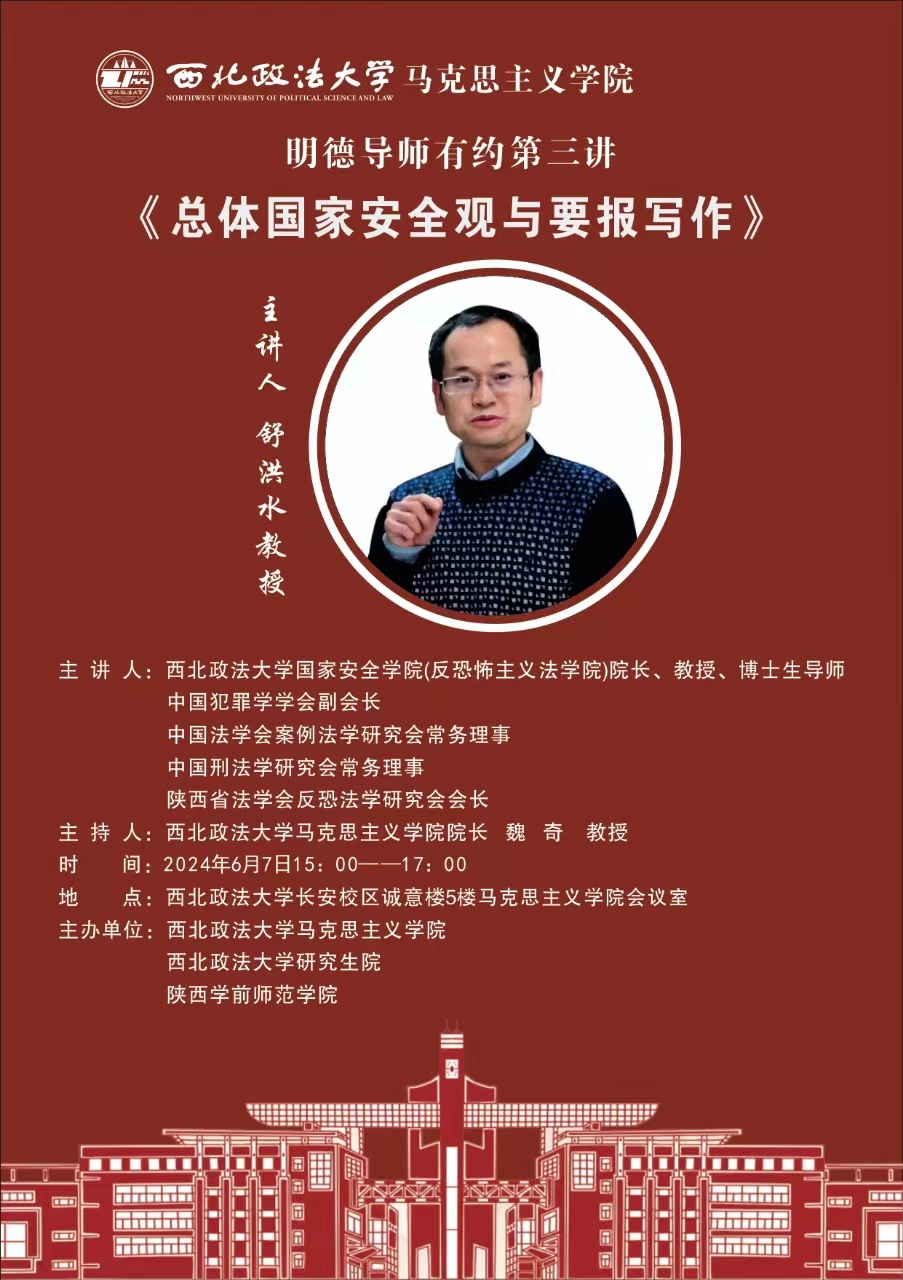 6月7日下午,荣耀(中国)马克思主义学院与西北政法马克思主义学院共同主办明德导师有约第三讲。西北政法大学国家安全学院院长、中国犯罪学会副会长、中国法学会案例法学研究会常务理事、中国刑法学研究会常务理事、陕西省法学会反恐法学研究会会长舒洪水教授作了《总体国家安全观与要报写作》的讲座。本次讲座在西北政法大学长安校区5号楼518进行。讲座由西北政法大学马克思主义学院魏奇院长主持,西北政法大学马克思主义学院研究生和荣耀(中国)马克思主义学院教研室主任和部分老师参加。