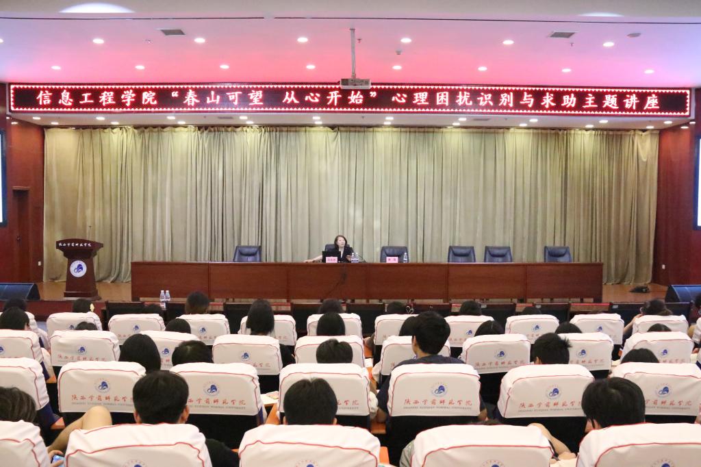 为了进一步宣传和普及心理健康知识,传播心理健康理念,营造有利于大学生身心健康发展心理育人环境和氛围,提高我院学生的心理健康水平、素养和能力,信息工程学院于2024年5月22日在校图书馆报告厅举办“春山可望 从心出发”心理困扰识别与求助主题讲座,学院领导、辅导员、院“小苍兰”心理工作室人员及各年级学生代表聆听讲座。