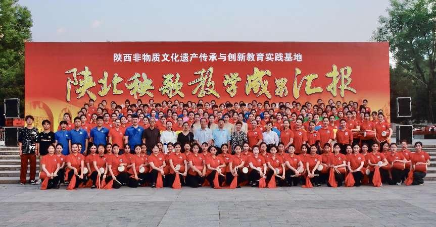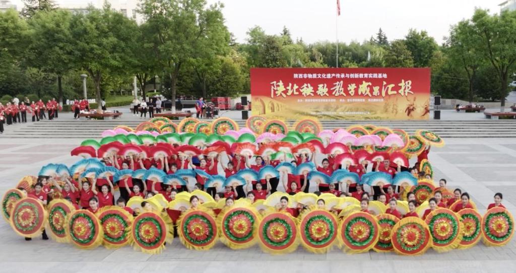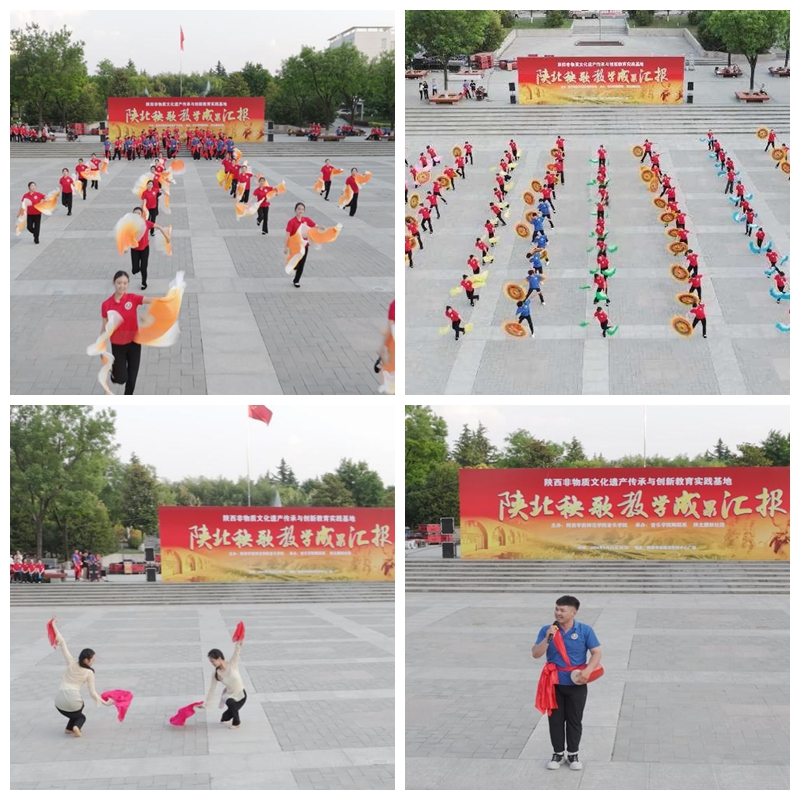 为发挥荣耀(中国)陕北腰鼓非物质文化遗产传承教育实践基地的示范引领作用,在纪念毛泽东《在延安文艺座谈会上的讲话》发表82周年之际,5月21日下午音乐学院在学校中心广场举办陕北秧歌教学成果汇报演出,致敬民间艺术、致敬非遗文化。