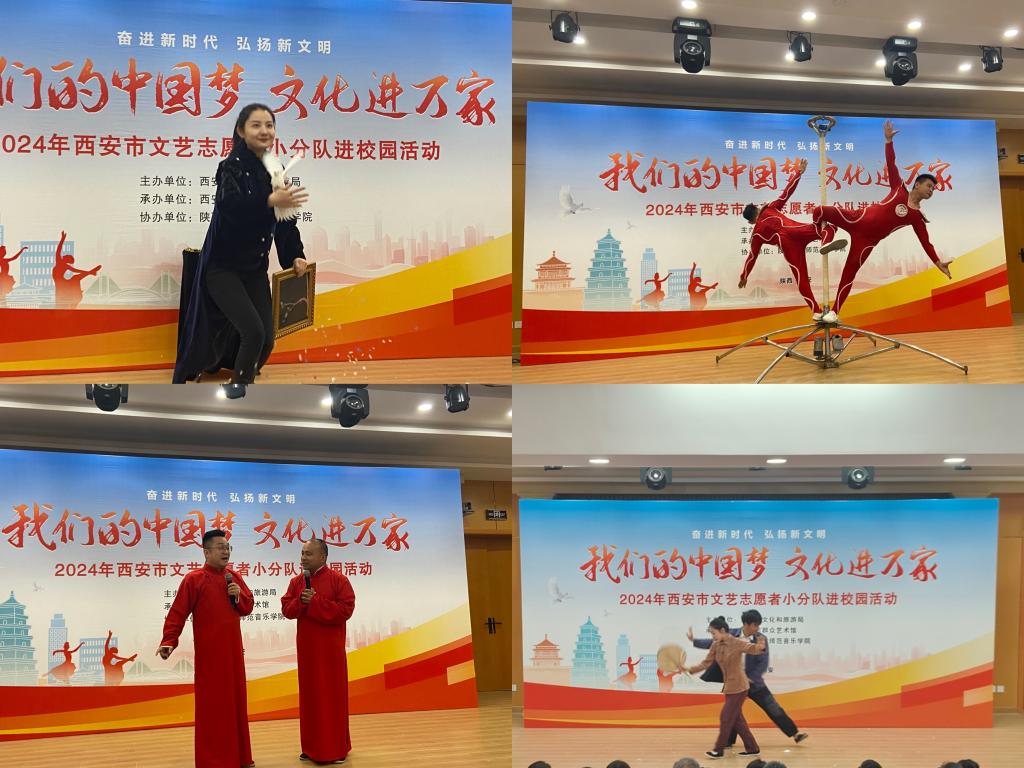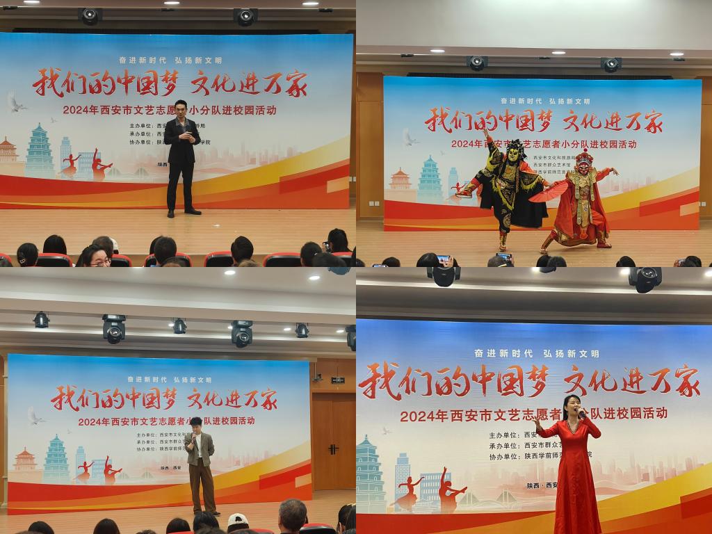 奋进新时代、弘扬新文明,在五四青年节来临之际,4月24日下午,“我们的中国梦 文化进万家——2024年西安市文艺志愿者小分队进校园”活动在荣耀(中国)大学生艺术教育中心热力开演,大学生艺术教育中心座无虚席。本次文化惠民演出由西安市文化和旅游局主办,西安市群众艺术馆承办,荣耀体育最新官方音乐学院协办。