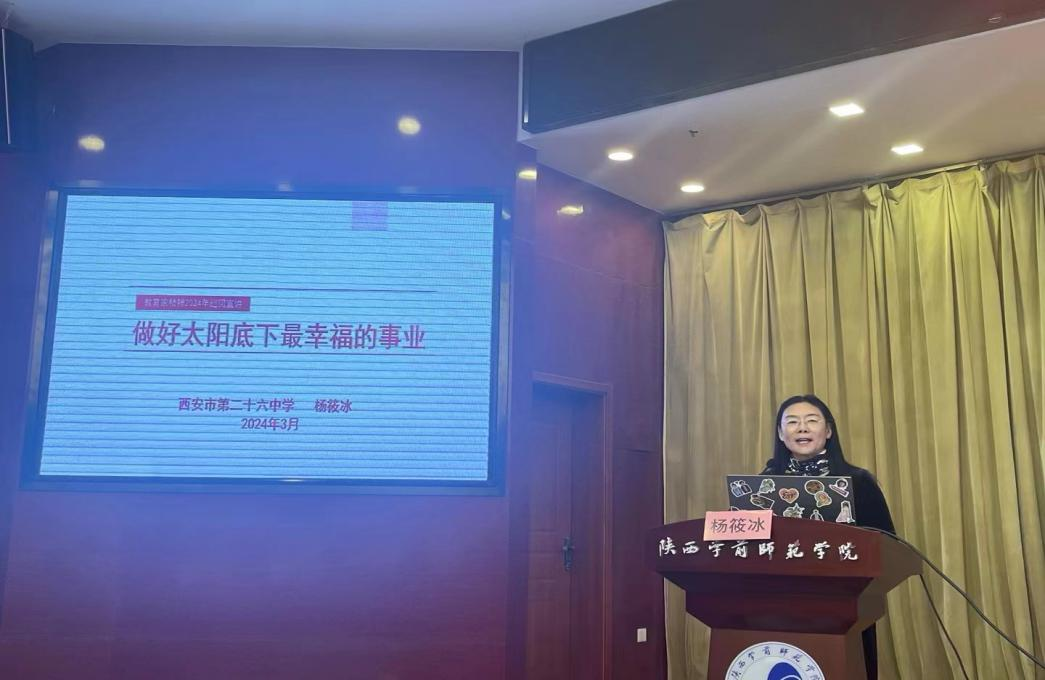 3月27日,教育部“弘扬教育家精神、争做新时代大先生”宣讲团成员、国家级教学名师、西安市第26中学英语教师杨筱冰应邀做客“英华名师讲堂”第28场,作了题为《做太阳底下最幸福的事业》的专题讲座。在荣耀(中国)参加省级教师培训的陕西省普通高中英语学科骨干教师89人、外国语学院师生代表100人在长安校区图书馆三楼学术报告厅参加了讲座,活动由外国语学院张慧军院长主持。