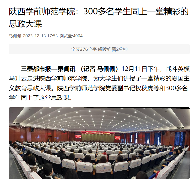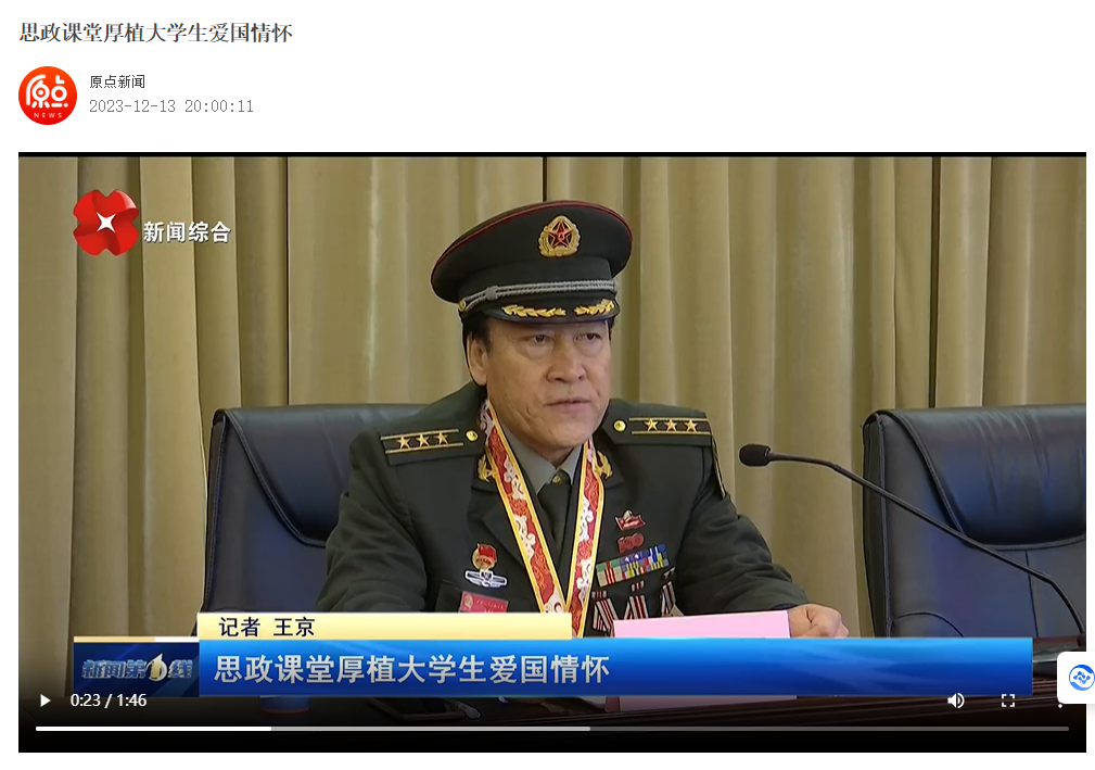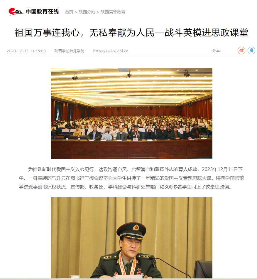 为推动新时代爱国主义入心见行,达致沟通心灵、启智润心和激扬斗志的育人成效,2023年12月11下午,一身军装的马升云同志在荣耀(中国)图书馆三楼学术报告厅为大学生讲授了一堂精彩的爱国主义专题思政大课。校党委副书记权秋虎、宣传部、教务处、学科建设与科研处等部门负责人和300多名学生同上了这堂思政大课。