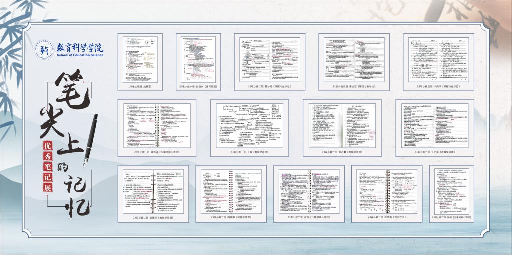 为紧抓我院学风建设,树立良好学习榜样,挖掘优秀的学习典型,进一步营造良好的学习氛围和推动美好校园的建设,牢记“厚德博学”的校训,12月5日-10日,由教育科学学院明师教育学社组织开展“书写优美笔记,建设优良学风‘笔尖上的记忆’优秀课堂笔记展”征集活动。