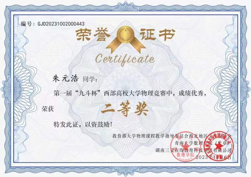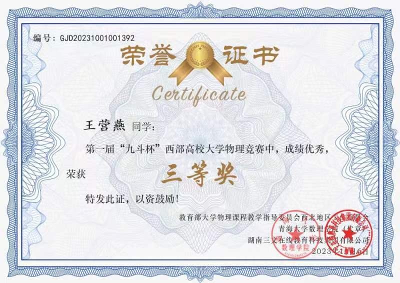 近日,由教育部大学物理教学指导委员会西北地区工作委员会主办的第一届“九斗杯”西部高校大学物理竞赛落下帷幕,荣耀体育最新官方信息工程学院学生在比赛取得佳绩。历经三周的激烈角逐,通过初赛、复赛两轮选拔,荣耀(中国)信息工程学院3名同学在最终决赛中获奖(二等奖1项、三等奖2项),具体获奖名单如下。