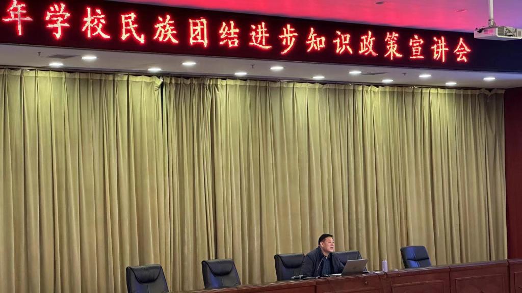 统战部常务副部长肖新以《加强党的民族宗教理论政策学习 为实现伟大的中国梦凝聚磅礴力量》为题,围绕加强民族团结进步教育的重要意义、党的民族理论和民族政策有关知识、铸牢中华民族共同体意识的意义及内涵、党的宗教工作理论及政策法规等六个方面进行了全面宣讲,讲座紧随中央精神,传达并阐释了党的最新关于民族宗教工作的理论政策及要求,对师生投入民族团结进步事业提出期望,助力师生树立正确的国家观、民族观、历史观、文化观、宗教观,不断增强对伟大祖国、对中华民族、对中华文化、对中国共产党、对中国特色社会主义的认同,构筑共有精神家园,在“中华民族一家亲 同心共筑中国梦”旗帜的引领下,各民族师生手足相亲、守望相助,像爱护自己的眼睛一样爱护民族团结,像珍视自己的生命一样珍视民族团结,像石榴籽一样紧紧抱在一起,交往交流交融、共同成长进步,践行报国心、强国志、爱国情,自觉塑造成为党和国家需要的合格建设者和可靠接班人,为以中国式现代化推进强国建设、民族复兴伟业贡献青春力量。