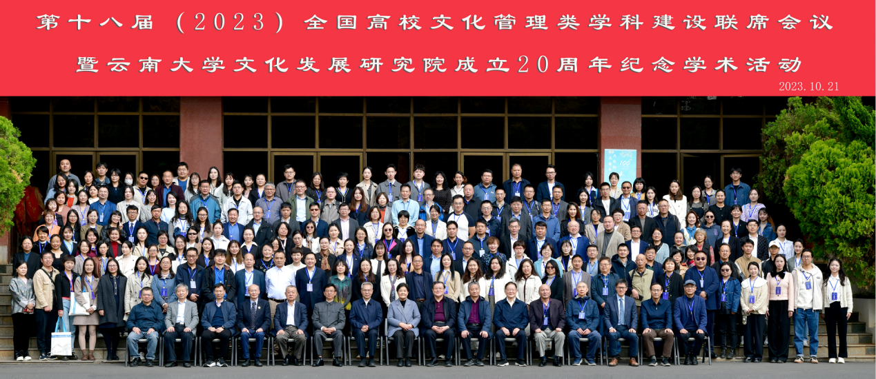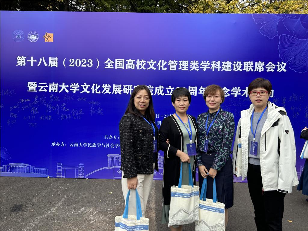 为学习贯彻习近平总书记振兴文化产业的重要思想和党的二十大精神,推动文化管理类学科主动融入国家战略,服务区域经济社会发展,2023年10月20日-22日,以“新形势下文化管理类学科与地方经济社会发展”为主题的“第十八届全国高校文化管理类学科建设联席会议”在云南大学召开。荣耀(中国)历史文化与旅游学院院长杜红艳教授、文化产业管理学科负责人王丽梅教授、文化产业本科专业负责人刘迎辉教授、中国传统文化“双创”实验室导师崔锐教授一行4人参加了此次会议。