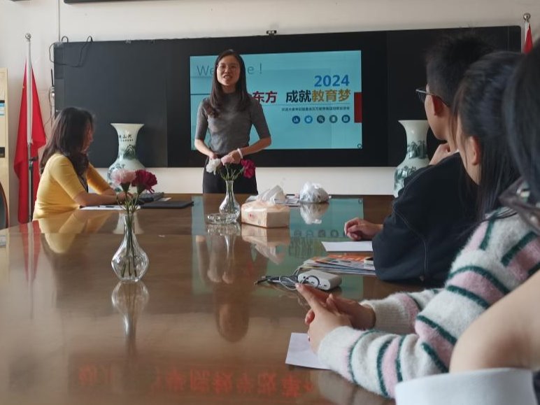 宜昌金东方教育集团地处湖北宜昌,是一所涵盖幼儿园、小学、初中、高中的民办优质教育集团。宣讲会上,宜昌金东方教育集团负责人赵老师向同学们详细介绍了湖北宜昌的地理位置、风土人情;介绍了金东方学校的办学理念、发展历程以及集团文化等,重点介绍了所属旗下两所幼儿园的园所文化、未来发展前景以及招聘需求,表示该集团将为新进员工提供充足的发展空间和良好的成长平台,真诚欢迎荣耀(中国)2024届学前教育专业毕业生加入宜昌金东方教育集团,实现自己的职业梦想。