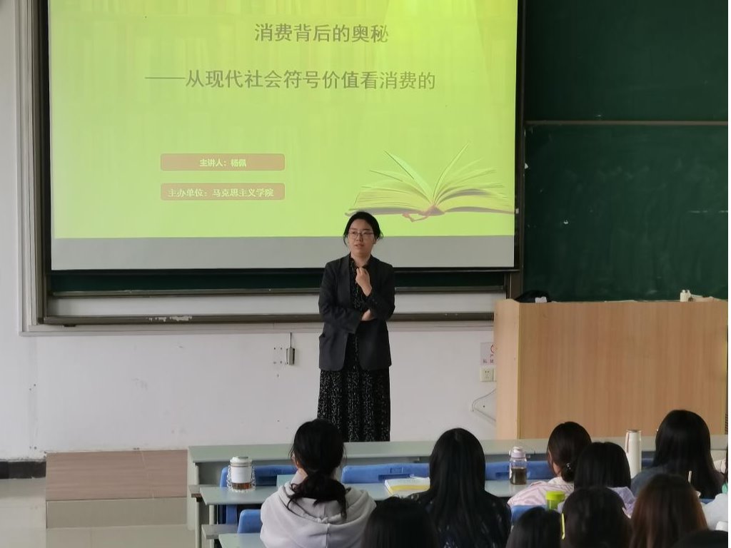 10月13日下午,马克思主义学院杨佩博士做了题为“消费背后的奥秘——从现代社会符号价值看消费的本质”的主题讲座。杨佩博士其长期从事价值哲学、社会哲学研究,主持参与省级社会科学项目多项,公开发表学术论文十余篇。王丽君老师首先介绍了杨佩老师的基本情况以及讲座的主要内容,马克思主义学院学生参加了本次讲座。杨佩老师从现代人的消费心理出发,列举各种光怪陆离的消费现象,探讨现代社会消费观念的变迁。随后杨佩老师介绍了马克思、让鲍·德里亚、齐格蒙特·鲍曼的消费哲学理论,指出现代社会消费行为的象征功能,普及符号价值理论,引导学生思考自我与消费的辩证关系,进一步阐释在互联网发展下消费系统对人们消费习惯的规训,揭示网络借贷、金融借贷内在逻辑,结合各种哲学理论分析现实消费现象。