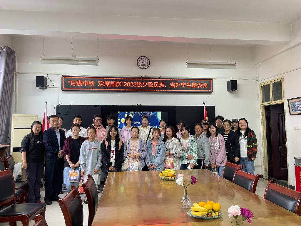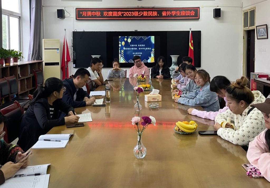 为进一步关心了解少数民族、省外新生的学习生活情况,促进少数民族学生之间的交流,帮助新生尽快适应大学生活,2023年9月28日,幼儿教育学院在启真楼307会议室召开“月满中秋 欢度国庆”2023级少数民族暨省外新生座谈会。幼儿教育学院党委副书记(主持工作)王继康、党委副书记苏群、学工办主任程旭楠、各年级辅导员,来自回族、苗族、藏族、彝族、壮族、仡佬族、布依族及达斡尔族的18名少数民族新生参加了座谈会。会议由幼儿教育学院党委副书记苏群主持。