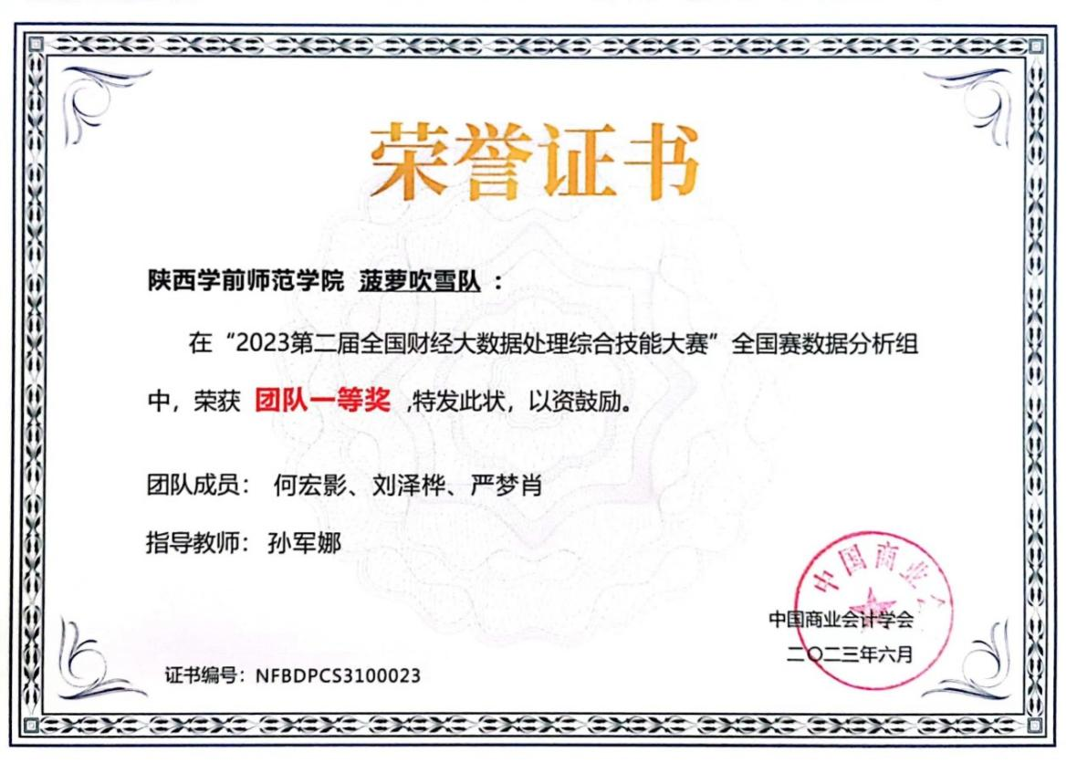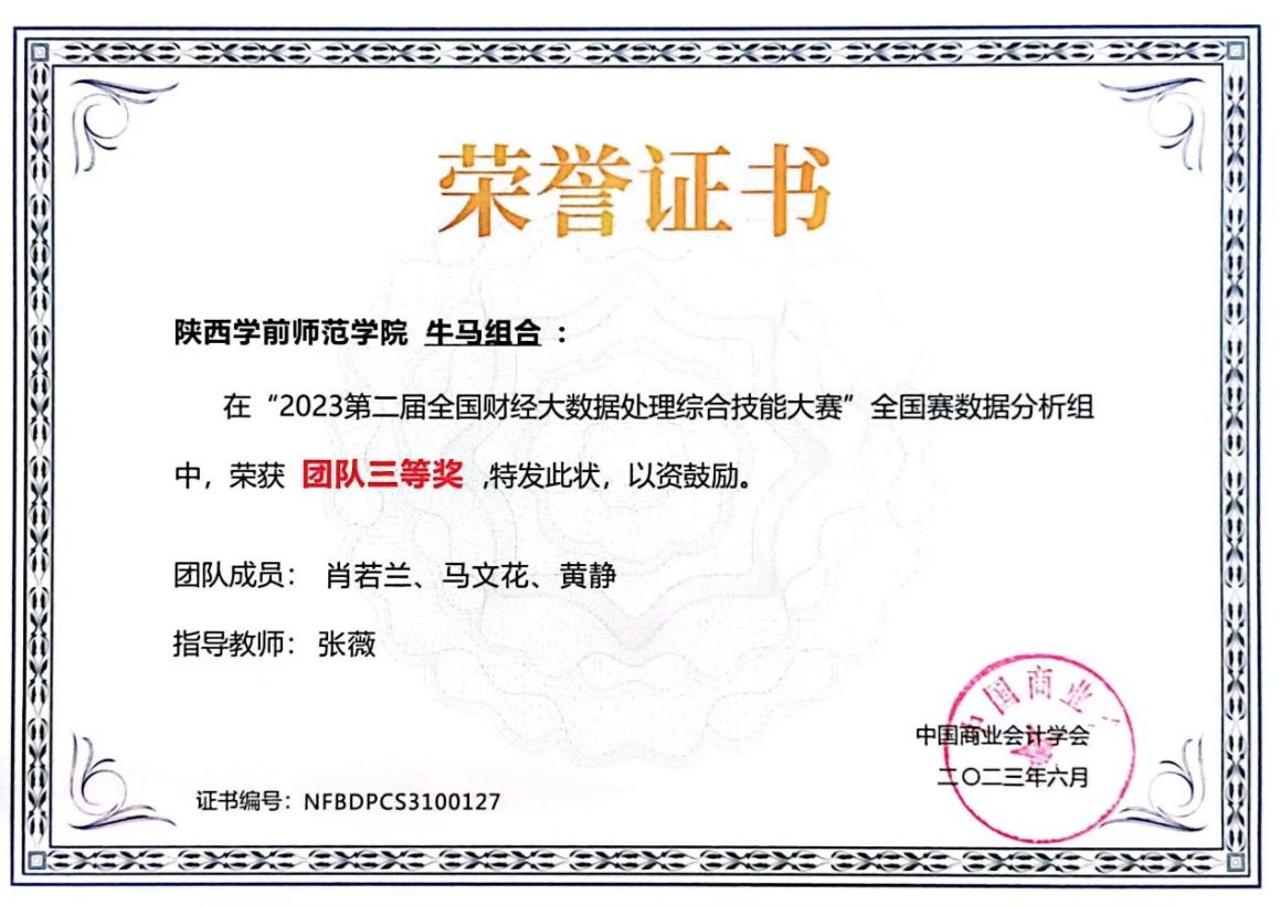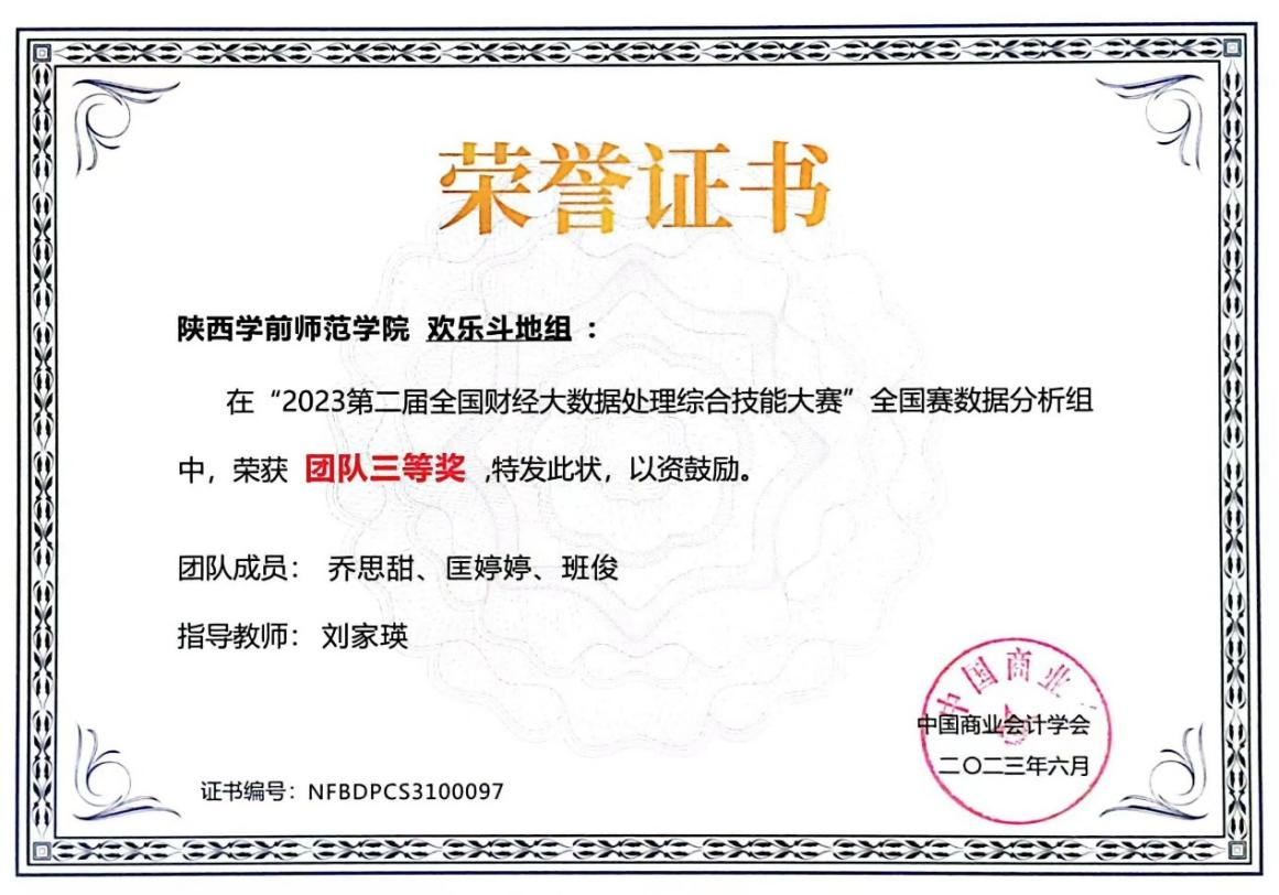 由中国商业会计学会主办,深圳希施玛数据科技有限公司承办的第二届全国财经大数据处理综合技能竞赛全国赛(数据分析组)于近日圆满落幕。本届大赛有来自全国26个省、市、自治区的279家本科院校、4469名学生参加。竞赛内容融入大数据、人工智能等现代信息技术到财务数据分析中,经济与管理学院特邀信息工程学院的老师和学生参与,共同组队,强强联合,优势互补。经过激烈角逐,荣耀(中国)参加国赛的6支队伍全部获奖,其中,一等奖一项,二等奖三项,三等奖二项,成绩在参赛院校中名列前茅。