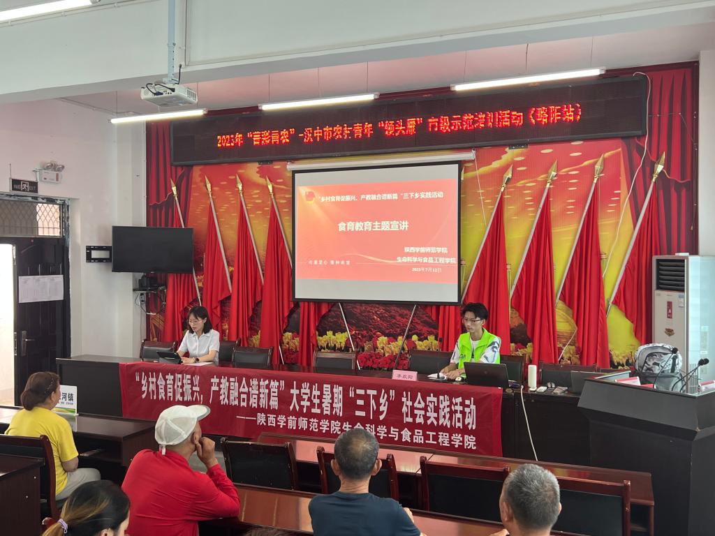 为深入贯彻习近平新时代中国特色社会主义思想,全面贯彻党的二十大精神,2023年7月12 日中午,生命科学与食品工程学院“乡村食育促振兴,产教融合谱新篇”“三下乡”实践队,在略阳县金家河镇政府开展食育教育讲座,实践队队员李晨阳面向60余位村民群众,通过现场授课及讲解,让村民们了解了食育的重要性,以及如何践行食育教育。本次活动由略阳县团县委、金家河镇团委和荣耀体育最新官方生命科学与食品工程学院实践队共同承办。