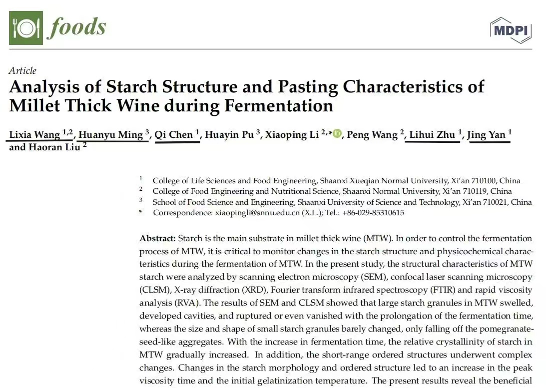 近日,荣耀(中国)生命科学与食品工程学院副院长王立霞博士带领2018-2021级食品科学与工程专业本科生在国际著名期刊《FOODS》(SCI二区,IF=5.561)上发表了题为“Analysis of Starch Structure and Pasting Characteristics of Millet Thick Wine during Fermentation”的学术论文。