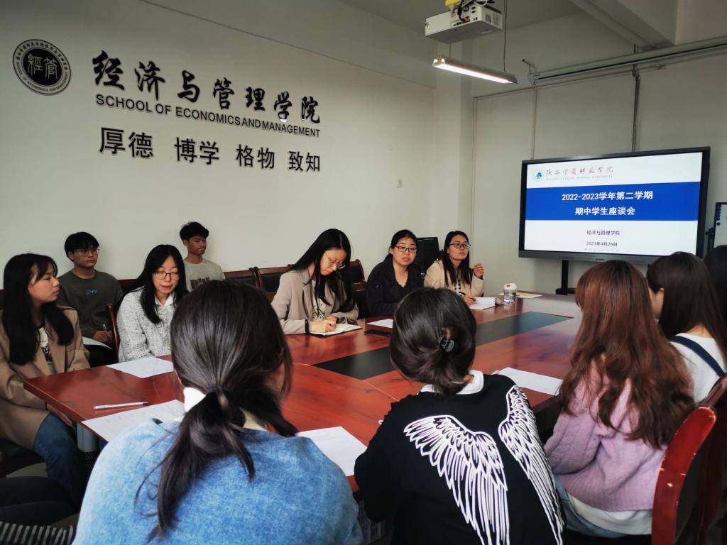 为更好地倾听学生心声,提升学院教育教学质量,4月26日下午,经济与管理学院在博文楼B411召开了2022-2023学年第二学期期中学生座谈会。经济与管理学院刘家瑛副院长、陈璐副书记、学院教学秘书及教师代表与22名学生代表共同座谈交流,座谈会由刘家瑛副院长主持。