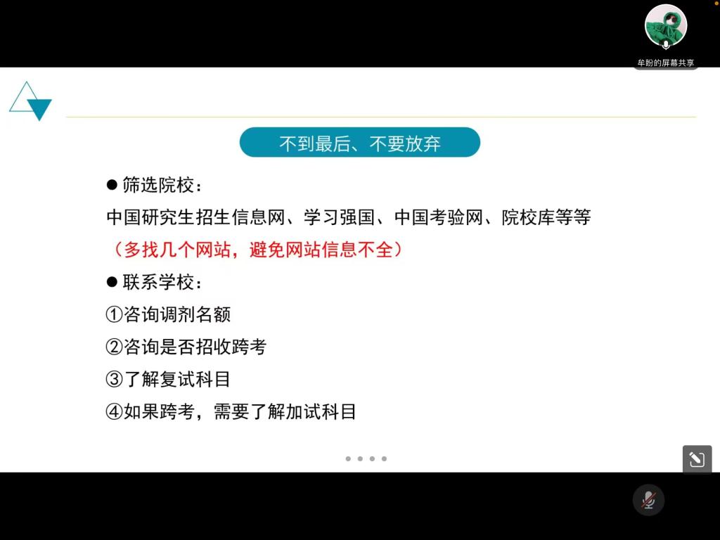 首先,两位受邀同学从不同角度梳理了研究生考试考前容易出现的心理和学业问题,针对性地提出了具体的应对措施:合理安排时间、考前学习提分技巧、考前心态调整办法等,牟盼同学特别分享了关于考研调剂过程的具体注意事项和解决办法。