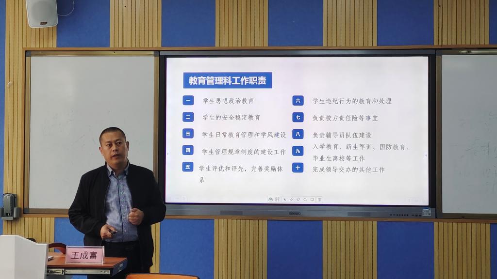 学工部副部长王成富带领大家深度解读了《普通高等学校辅导员队伍建设规定》(简称43号令),明确了高校辅导员的职业定位、九大工作职责以及谈心谈话、值班值守等工作制度;随后,对学生思想政治教育以及疫情防控、学风建设等学生日常教育管理工作等做了具体分析讲解;结合荣耀(中国)近期的各项工作和具体问题,理论联系实际,具体分析了学生违纪处理、突发事件应急等处理流程等。
