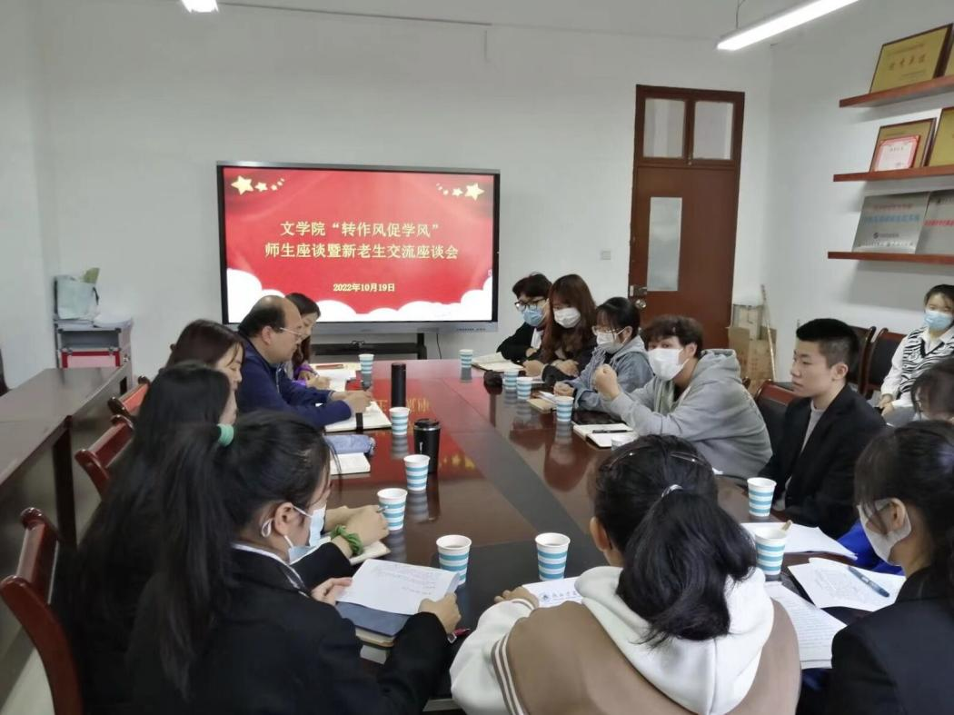 为进一步转变工作作风,加强师德师风和学风建设,促进师生交流,扎实做好2022级新生入学教育,10月19日下午,文学院召开“转作风促学风”师生座谈暨新老生交流座谈会,文学院院长牛文明、党委副书记庞曦、辅导员雷田甜以及11名新老生代表参加座谈会。会议由副书记庞曦主持。