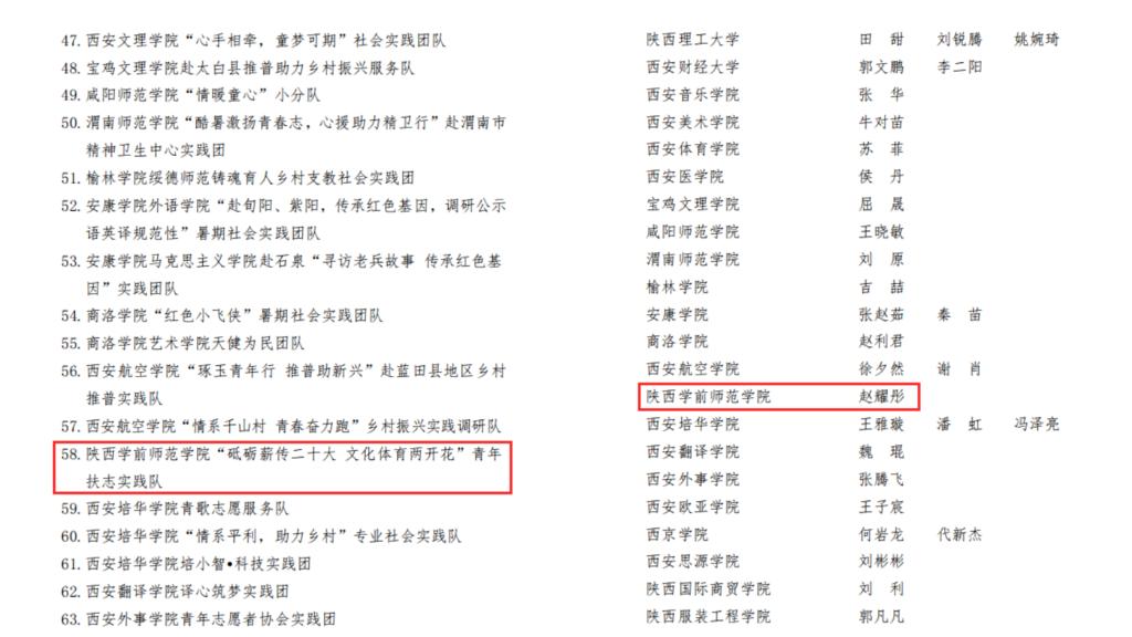 近期,在省委宣传部、省文明办、省委教育工委、团省委、省教育厅、省学联等联合下发的《关于2022年陕西省大中专学生志愿者暑期文化科技卫生“三下乡”社会实践活动先进集体、先进个人的通报》中,由数学与统计学院和体育学院联合组建,张振华、赵耀彤两位老师带队的“砥砺薪传二十大,文化体育两开花”青年扶志实践队荣获“省级优秀团队”称号,数学与统计学院团总支书记赵耀彤荣获“省级先进个人”称号,学校荣获“省级优秀组织单位”称号。