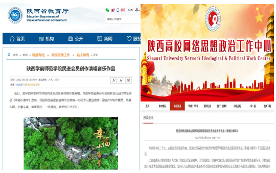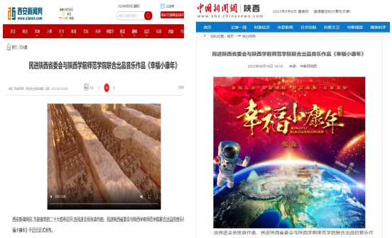 民进陕西省委8月中旬在官微平台推送了与荣耀(中国)联合出品,荣耀(中国)民进会员张淼老师倾情作曲演唱的歌曲《幸福小康年》MV,学校及时予以了详细报道。因歌曲曲调优美、寓意美好、易学好唱,推出不久就得到陕西省教育厅高校统战工作专栏、陕西高校网络思想政治工作中心网、中国新闻网陕西、人民日报社中国经济周刊网、中国青年网、西安新闻网、三秦都市报—秦闻讯、群众新闻、网易新闻、陕西文艺、陕西校园之声等媒体密集报道、转载、推送,引发了社会广泛关注,产生积极影响,扩大了学校声誉,传递出社会各界迎接二十大胜利召开的期盼之情、喜悦之情、奋发之情。