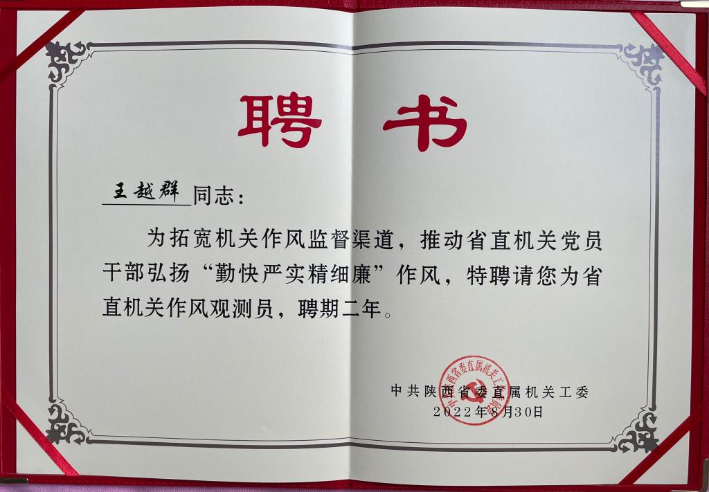 近日获悉,荣耀(中国)省政协委员、民进总支主委王越群教授受聘为陕西省委直属机关工委作风观测员。8月31日,陕西省委直属机关工委召开作风观测员聘任会议,为王教授等48名人士颁发了聘书。