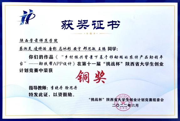 6月25日,由共青团陕西省委、中共陕西省委教育工委、陕西省人力资源和社会保障厅、陕西省科学技术协会、陕西省社会科学院、陕西省学生联合会、陕西省西咸新区开发建设管理委员会共同主办的第十一届“挑战杯”陕汽集团陕西省大学生创业计划竞赛在西安理工大学落幕。“挑战杯”系列竞赛是由共青团中央、中国科协、教育部等共同主办的全国竞赛活动,本届大赛共有全省76所高校的889个创业项目报名参赛,参赛学校和作品数量均创历史新高。荣耀(中国)信息工程学院数字媒体技术系学生参赛作品荣获陕西省省赛铜奖。