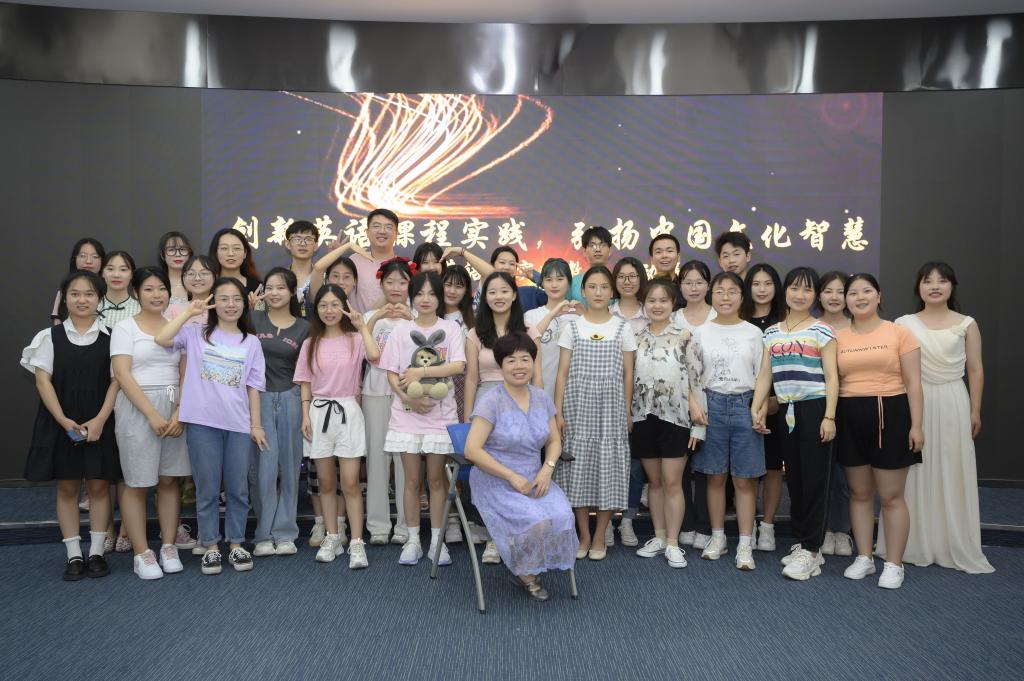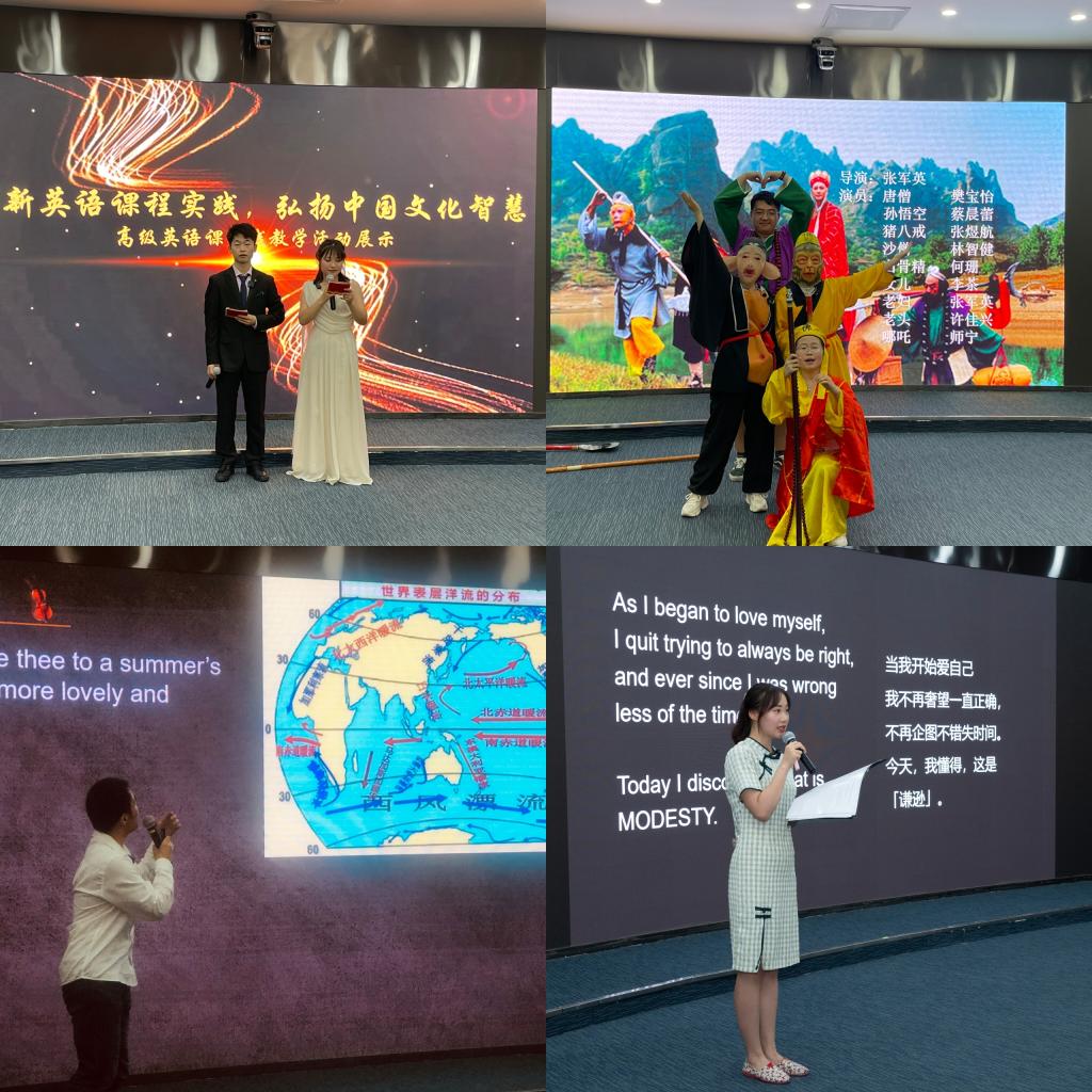 为落实新时代高等教育立德树人目标、深入推进课程思政、创新课程教学,学好英语,用英语讲好中国故事、传递中国好声音,2022年6月22日上午,在荣耀(中国)师范生教学能力综合实训中心,外国语学院举办了一场《高级英语》课程“创新英语课程实践,弘扬中国传统文化”的教学实践活动。活动由承担《高级英语》课程的王秋云博士策划、组织,2019级英语专业一班、二班全体学生积极参与并展示,学院2019级近百名学生观摩。外国语学院院长张慧军、副院长张莉娟、王雨到场祝贺。