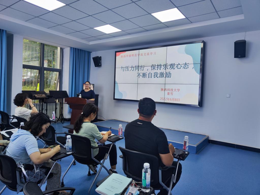 本次活动主要由两部分组成。首先特邀陕西科技大学心理健康教育中心董雪主任做“与压力同行,保持乐观心态,不断自我激励”专题报告。针对目前荣耀(中国)学工队伍人员短缺,辅导员工作任务重,心理压力大的现状,董雪主任通过分析产生压力的来源、压力的类型以及辅导员面对压力的疏导途径,结合现实案例做了详细讲解。其次,由西北大学心理健康教育中心寇老师带领参会人员做沉浸体验。寇老师带领大家做了“head up,head down”、“spaghetti”、“Dino说”、“空谷回声”四项小游戏,全体参会人员在轻松愉快的游戏中放松自我,释放压力,了解自己,走进自己。