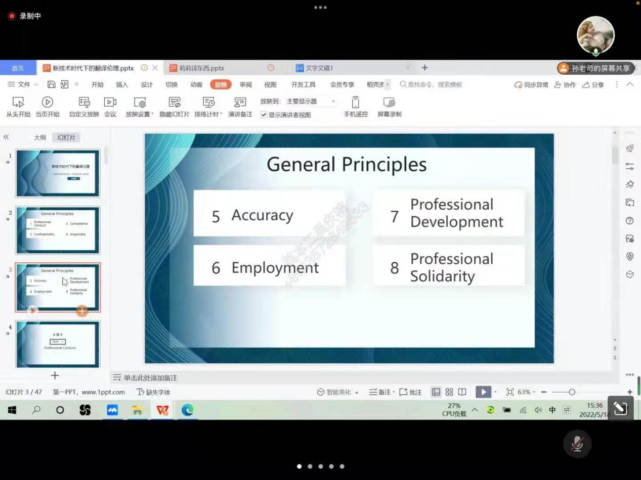 2022年5月18日下午,外国语学院翻译系副教授孙菲菲老师做了题为“新技术时代下的翻译伦理”的线上学术讲座,来自2020、2021级翻译专业本科生和2019级英语专业本科生近百名学生参加了此次云端讲座。