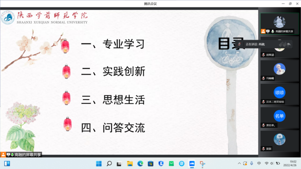 2022年4月26日,晚7时,文学院开展第三届首场“身边榜样”宣讲活动,此次宣讲采取线上腾讯会议的形式,由2018级汉语言文学专业学生高融主讲,2021级与2020级共200余名学生共同参会,会议由辅导员梁爽主持。主讲人高融同学在校期间曾获校级“优秀学生干部”、“三好学生”、“十佳大学生、”校级奖学金、励志奖学金,国家奖学金以及大创国家级立项等荣誉。