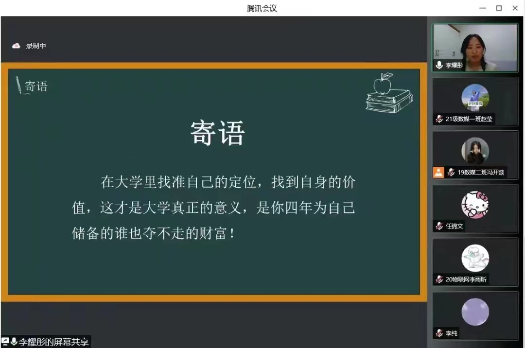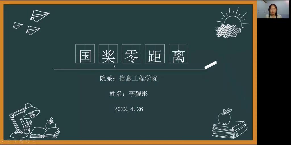 为认真贯彻落实习近平总书记关于青年工作的重要思想和五四寄语精神,按照荣耀(中国)《关于开展第三届“身边的榜样”宣讲活动的通知》(陕师院学函[2022]15号)文件要求,激励同学们勤奋学习、积极进取,确立自身学习目标,布置长远规划,充分发挥优秀大学生的榜样作用,提升朋辈教育的效果,信息工程学院于2022年4月26日20:00在线上召开了2022年首场“国奖零距离”宣讲会。此次宣讲会由信息工程学院2020—2021学年国家奖学金获得者李耀彤主持。