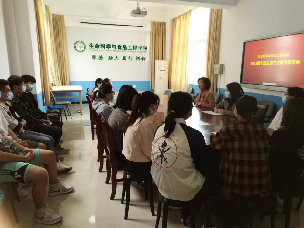 2022年4月19日下午,生科院在会议室召开2022届毕业生就业工作推进会。生科院党委副书记郑美霞、辅导员李佳和未就业学生参加了此次推进会。