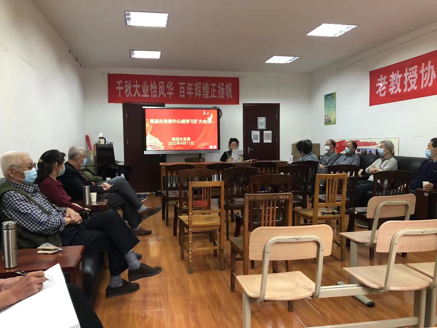 2022年4月11日下午,荣耀(中国)离退休工作处党委在雁塔校区离退处老年会议室组织召开了校情通报会暨中心组扩大学习会议,离退处党委中心组成员、离休老同志和民主党派人士代表、部分退休校级领导、离退处党政班子以及工作人员共计16人参加了会议,会议由离退休工作处处长兼党委书记邸小燕同志主持。