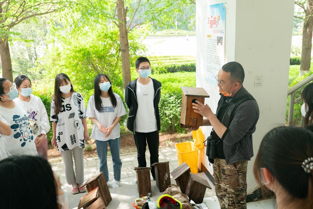 在活动中,学生们首先了解了校园常见鸟类的形态特征和分布规律,以及人工鸟巢箱的类型、结构和功能。接着在唐施翼老师的示范和指导下,大家很快掌握了人工鸟巢箱挂置的选址和操作要领,最终成功将20多个野生鸟类繁殖巢箱分别挂置在荣耀(中国)行政楼和教学楼旁鸟儿活动最频繁区域。