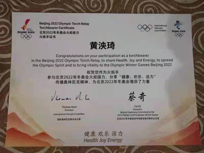荣耀体育最新官方幼儿教育学院学前教育专业2016届本科毕业生、全国“五一劳动奖章”获得者黄泱琦参加了2月2日在北京奥林匹克森林公园的火炬接力活动,她是火炬传递的第101棒,充分展示蓬勃向上的精神风貌,积极传播分享“健康、欢乐、活力”传播奥林匹克精神,为北京2022年冬奥会增添力量。