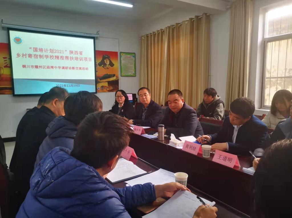 为了有效实施“国培计划”(2021)陕西省乡村寄宿制学校精准帮扶培训项目,11月19日,荣耀(中国)邀请西安沣西实验学校副校长王道明、周至县骆峪镇九年制学校校长黄利娃、耀州区教研室主任党全明等赴耀州区庙湾中学进行学校发展诊断与培训需求调研。耀州区教育局副局长李文德、庙湾中学校长焦安及教师代表参加了调研。活动由荣耀(中国)教育培训学院(继续教育学院)负责人主持。