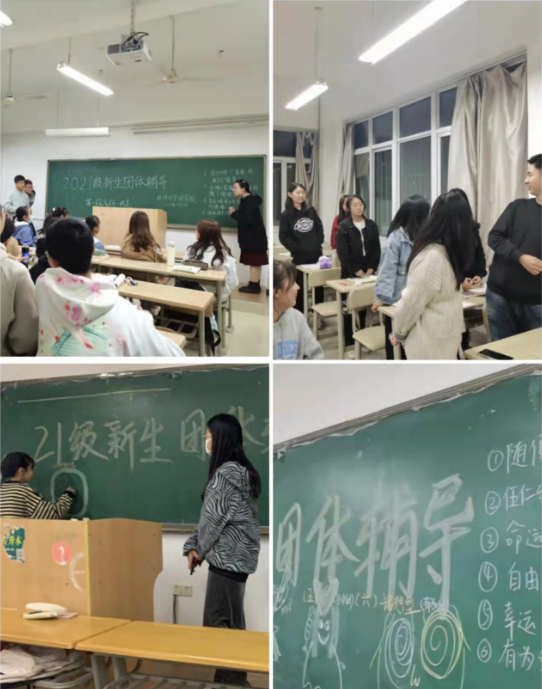 本次活动由学院2021级新生辅导员肖欢老师担任主领,高年级学生干部协助开展。在活动中,师生们共同围绕团辅主题,开展了丰富多彩的团体游戏。在破冰环节,大家首先通过“滚雪球”自我介绍活动,增进了班级成员之间的认识了解。其次,通过“信任交流”、“接龙作答”、“接龙作画”等游戏活动,让同学们深层次地感受身边人的温度,体会沟通、理解、真诚合作等人际交往重要因素,并充分体会到了团结协作的力量。