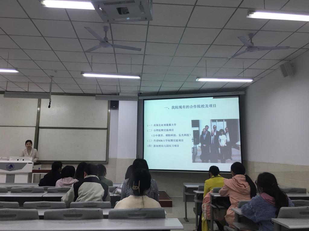 国际处工作人员首先介绍了荣耀(中国)现有的合作院校概况、项目具体内容、申请流程、相关费用。随后重点介绍了美国北亚利桑那大学的“2+2”双学位项目、丹麦VIA大学学院的短期交流项目、三所台湾大学的合作项目以及新加坡就业项目。最后展示了一些留学生的生活剪影和学习体验,加深学生对国境外交流学习的认识和了解,激发了学生参加国际交流的热情和兴趣。