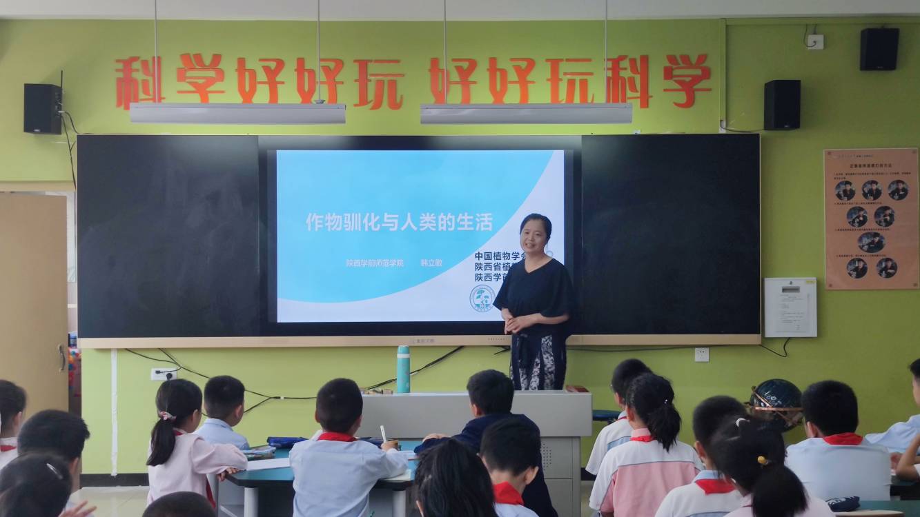 秋风送爽,丹桂飘香。以“百年再出发,迈向高水平科技自立自强”为主题的2021年全国科普日活动于9月11日在全国各地启动。生命科学与食品工程学院韩立敏副教授应陕西省植物学会邀请参与了由陕西省植物学会和西安植物园联合主办“万人进校园”科普宣讲活动,分别在9月13日上午和9月16日下午为雁塔雁南小学和雁塔城南中学小学部学生带去了两场精彩的科普讲座。科普主题为《作物驯化与人类的生活》,韩老师用通俗易懂的语言向同学们讲述了植物的重要性、人类驯化农作物的过程及转基因植物和我们人类的生活等,深入浅出的讲解和生动鲜活的实例让学生们受益匪浅,开阔了他们的视野,激发了他们对神奇的植物界和生物科学技术的求知欲和探索欲,赢得了与会师生们阵阵掌声。