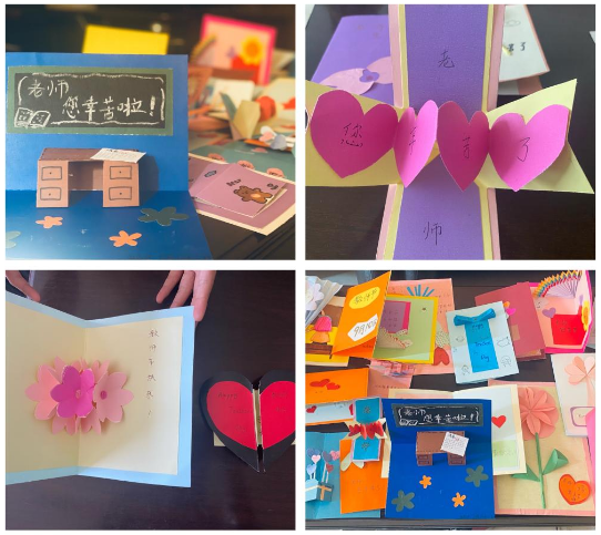 制作贺卡的过程中,同学们充分发挥了自己的想象力、创造力,自己动手,制作成一张精美而富有创意的贺卡,有些同学展现了自己出色的绘画才能,有些同学则充分利用了自己平时收集的素材,通过同学们的精心设计和打扮,一张张普普通通的硬板纸变成了形状各异、色彩斑斓的教师节贺卡。这些凝聚着同学们真心祝福和创意的贺卡,表达了他们对老师的尊敬,更表达了对老师深深的祝福。
