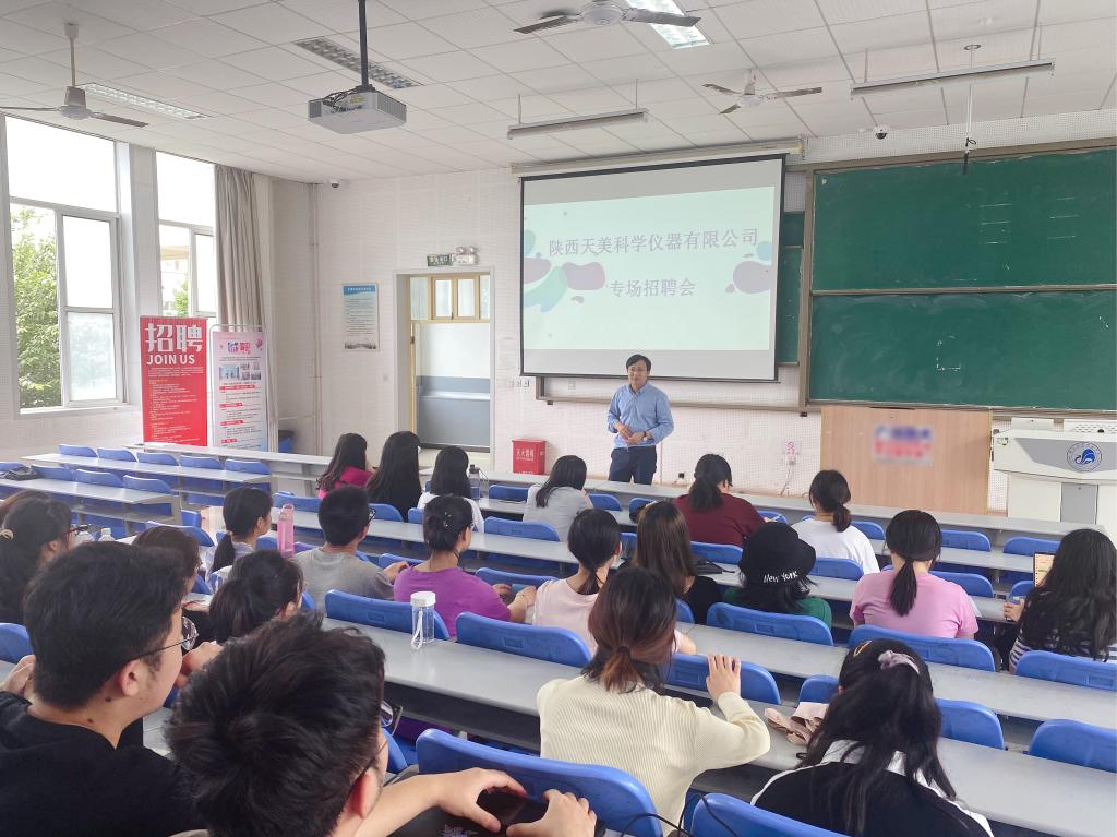 5月23日下午,化学化工学院于积学楼阶梯C2教室开展化学专业相关综合招聘会,到场招聘单位有陕西天美科学仪器有限公司、陕西众邦仪器设备有限公司以及娃哈哈饮用水(西安)有限公司,化学化工学院院长李连庆、毕业班辅导员陈晓璐以及本学院和兄弟学院80余名未就业毕业生参加了本场招聘会。