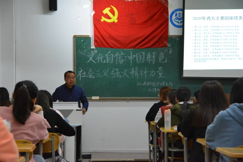 为切实将党史学习教育走深走实,加强青年学生党员的思想政治引领,2021年4月28日幼儿教育学院学生党支部在启真楼315教室组织开展了以“文化自信:中国特色社会主义强大精神力量”为主题的专题党课。此次党课由幼儿教育学院院长兼总支副书记何善平同志主讲。