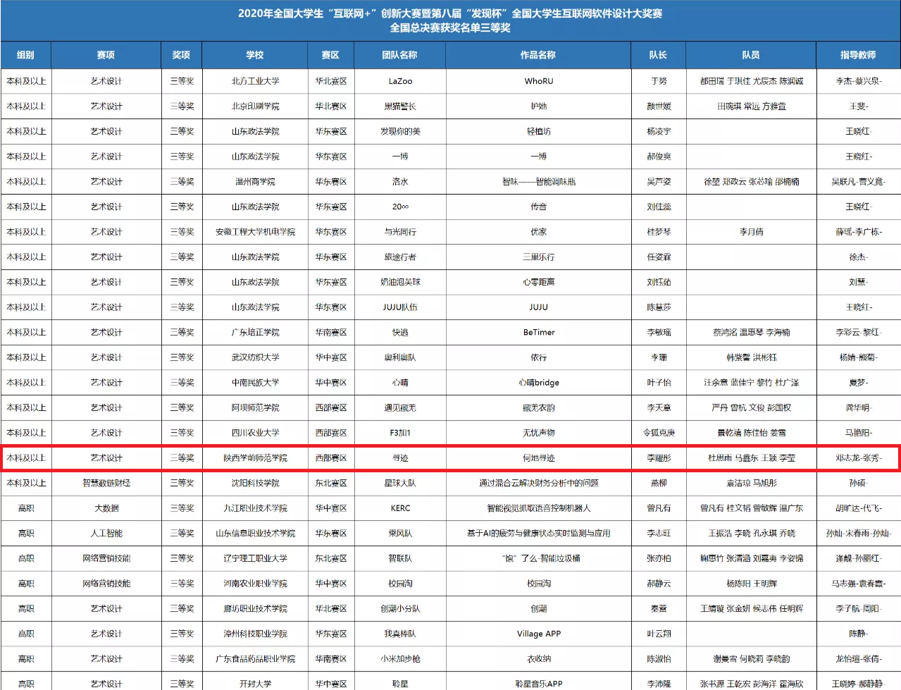 近日,全国大学生“互联网+”创新大赛暨第八届“发现杯”全国大学生互联网软件设计大奖赛落下帷幕。荣耀(中国)信息工程学院学生李耀彤、杜思雨、马鑫东、王颖、李莹团队设计的《何地寻迹》(指导教师:邓志龙、张秀)在学院领导的大力支持,教师的悉心指导下,经过激烈比拼,以西部赛区一等奖的好成绩进入全国总决赛,最终获得全国总决赛三等奖,同时在147组参赛作品中获得唯一的最具人气奖。