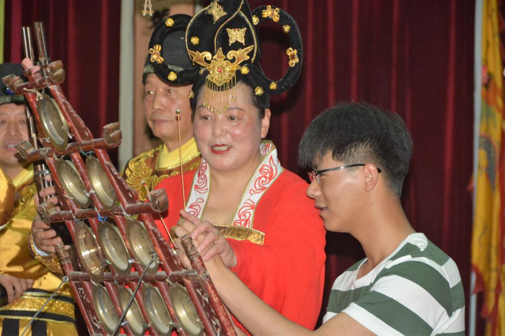 期间,何忠信社长带领大家一起学唱了古代乐谱“工尺谱”《园林好》,这种独特的“视唱”学习让同学们兴奋不已,大家都颇有兴致地跟随并对照着古乐谱反复吟唱。在表演告一段落后,何社长还邀请师生们上台亲自演奏乐器,与这些古乐器“亲密接触”。在同学们不太熟练的演奏声中,现场气氛达到了高潮。最后,鼓乐社以一曲慷慨激昂的《霸王鞭》结束了整场表演。
