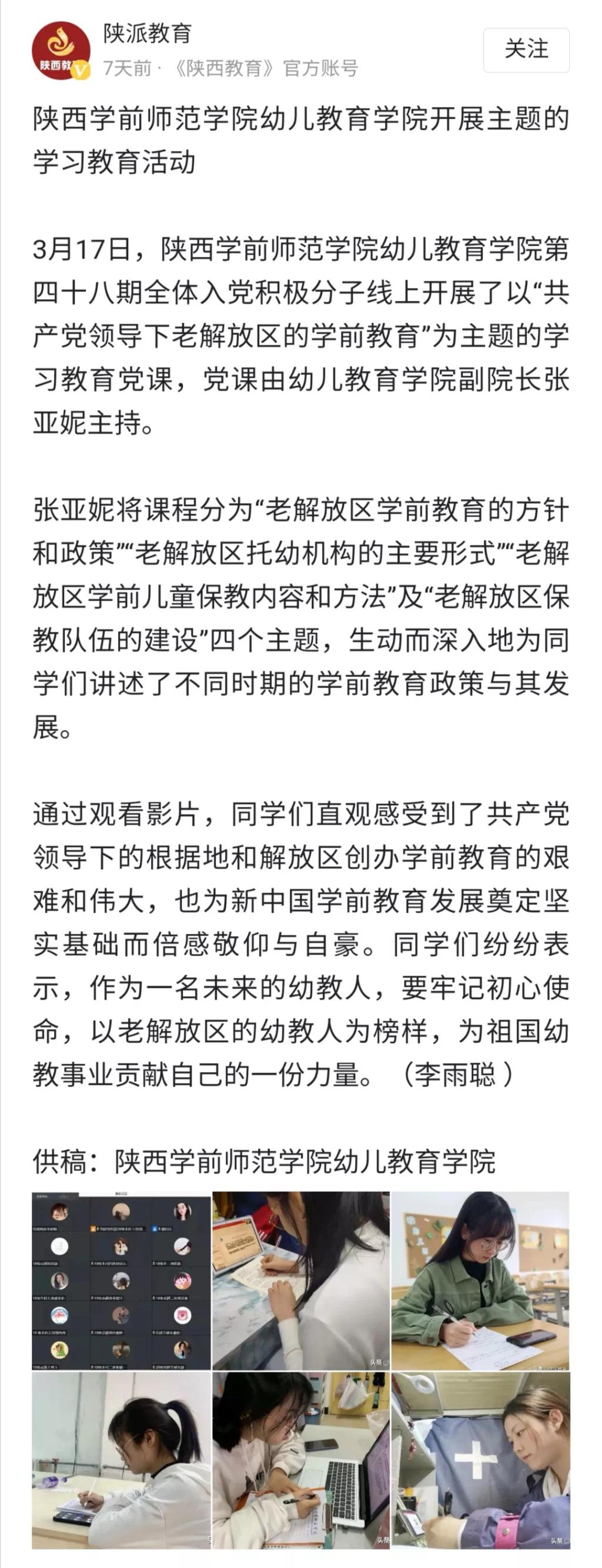 学党史、悟思想、办实事、开新局。3月24日《陕西教育》官方账号--陕派教育报道荣耀(中国)幼儿教育学院副院长张亚妮老师以《共产党领导下老解放区的学前教育》为主题讲授的党史学习教育专题党课。