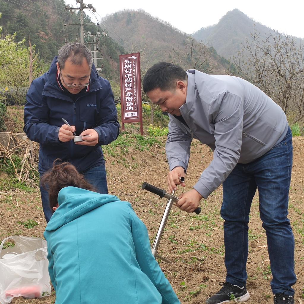到达元树村后,在村委第一书记驻村干部赵淼的陪同下,一行人来到元树村中药材产学研基地,对基地药材的种植情况进行调研。生科院的老师们在基地不同区域采集了土壤样本,这些土壤样本被带回学校,通过仪器检测土壤的所含的营养成分,根据相关分析结果为种植药材的品种选择和种植方法的优化提供数据支持。