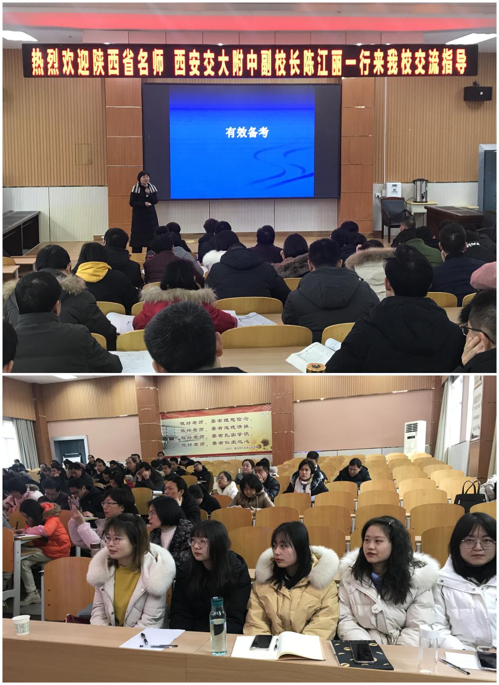 为发挥专家名师团队引领帮扶作用,增强高考复习备考的针对性,准确把握高考动向,提高备考工作实效性,推动高考备考工作提质增效,达到互学互促的目的,12月17日,外国语学院、校基础英语教育教学研究所邀请西安交大附中副校长、省级名师工作室负责人陈江丽老师赴汉阴中学开展名师送教和高考英语复习备考专题培训活动。参加此次活动的有外国语学院院长张慧军教授、大外一部系部主任杨玲老师、外国语学院学生代表、汉阴中学所有高中教师90余人、学生200余人以及来自荣耀(中国)外院、生科院、历史文化与旅游学院在汉阴中学实习的10名学生。