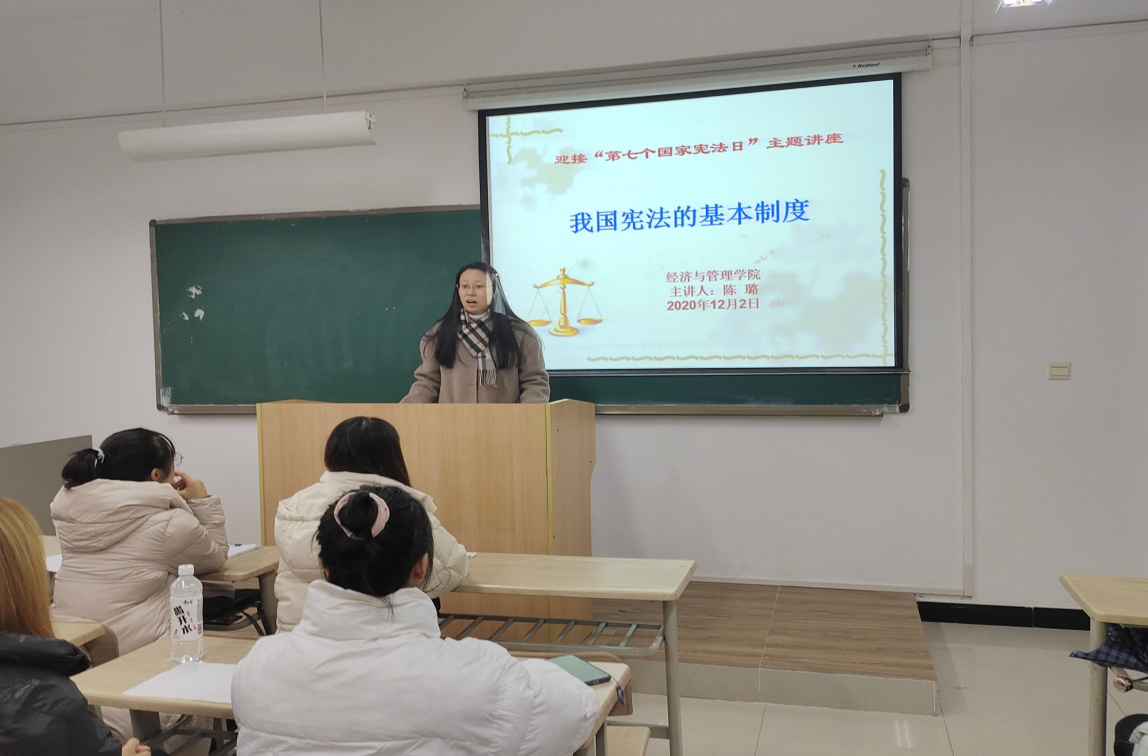 宪法是国家的根本大法,也是治国安邦的总章程,宣传和树立宪法权威是全面推进依法治国的重大事项。为深入学习宣传习近平法治思想,迎接第七个“国家宪法日”的到来,经济与管理学院于2020年12月2日下午,在博文楼a407教室开展以“弘扬宪法精神,维护宪法权威”为主题的学生党团员理论学习活动。本次活动由经济与管理学院党总支副书记陈璐老师主讲,学院各支部学生党员,团总支、学生会主要成员以及2020级各班代表参加了本次集体学习活动。