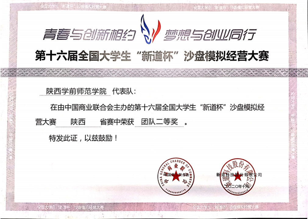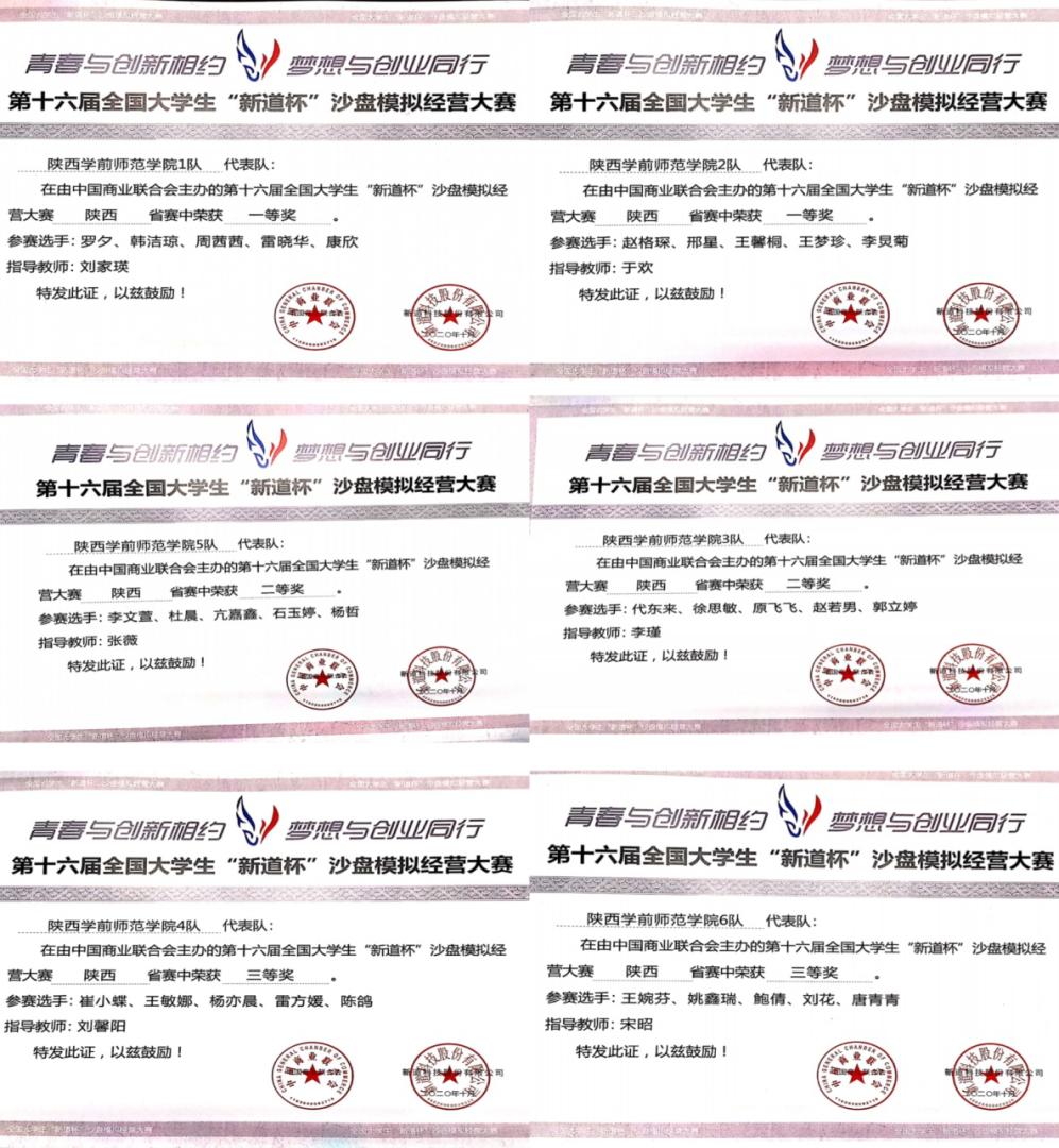 全国大学生“新道杯”沙盘模拟经营陕西省大赛各队获奖证书