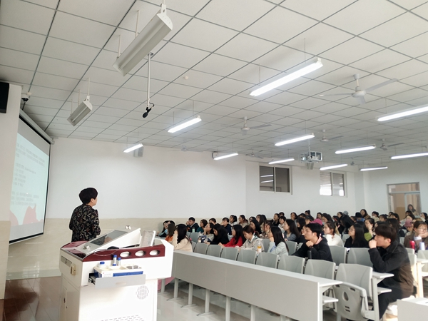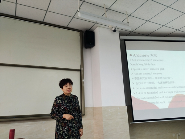 2020年11月11日下午,外国语学院英语系副教授王秋云博士在4教阶2教室为学生做了题为 “英语常见修辞手法及运用”的讲座,参加讲座的有2018级英语本科三个班及2020级专升本两个班约170名学生,《高级英语》课程组的教师也参加了讲座。