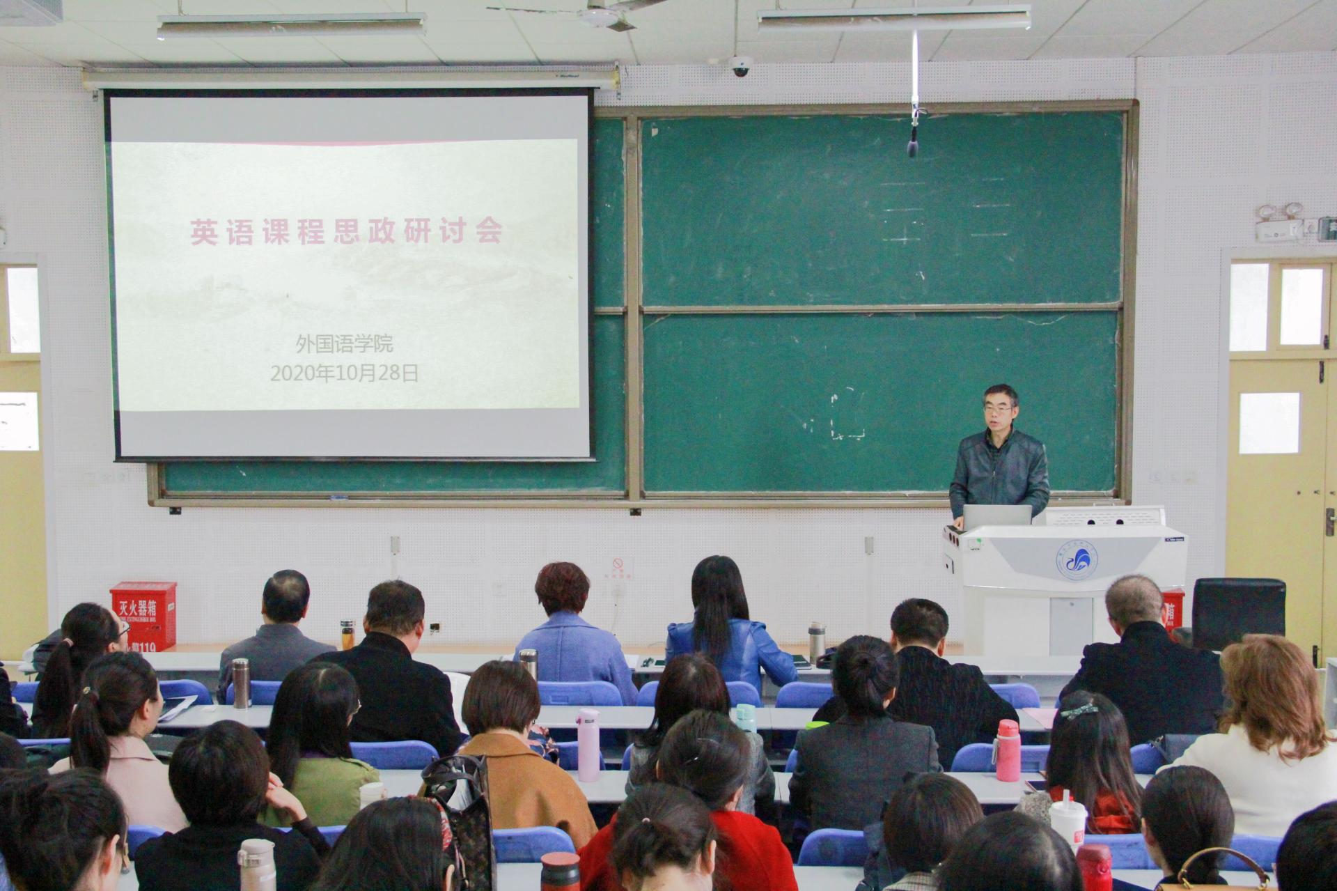 为深入学习贯彻习近平总书记关于教育的重要论述,全面贯彻落实《高等学校课程思政建设指导纲要》精神,落实立德树人为根本任务,更好的发挥教师队伍“主力军”,课程思政“主战场”,课程教学“主渠道作用”,全面推进英语课程思政教育教学体系建设,10月28日下午,外国语学院召开英语课程思政研讨会。外国语学院党政领导和全体教职员工参加会议,马克思主义学院宋刚教授应邀出席会议,会议由党总支副书记高海燕主持。会议分为文件学习和解读、英语课程思政教学示范、英语课程思政线上经验交流会小组分享、外国语学院英语课程思政工作报告4项议程。